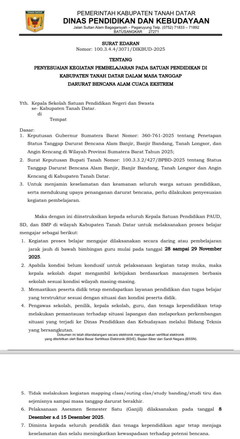Kepala Dinas Pendidikan dan Kebudayaan Tanah Datar Inhendri Abbas, menyampaikan, bahwa penyesuaian kegiatan belajar mengajar dilakukan untuk menjaga keselamatan seluruh warga sekolah serta mendukung kelancaran upaya penanganan darurat bencana.