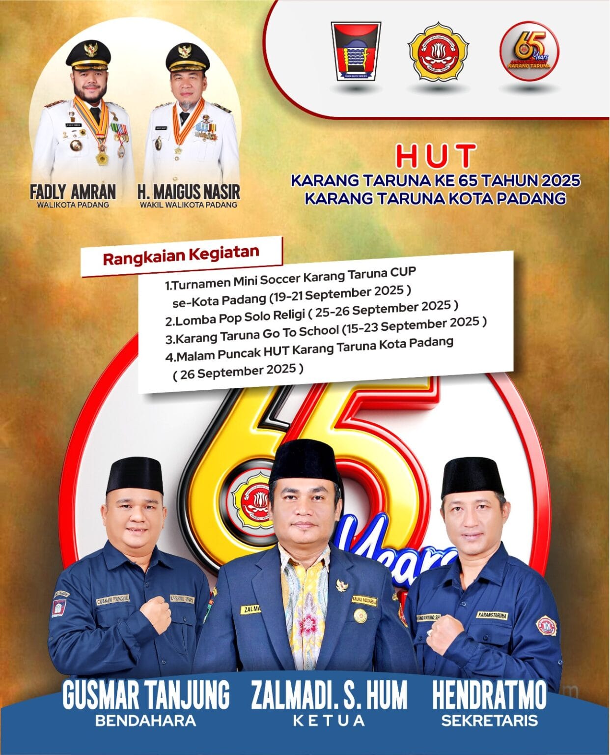 PADANG | Usia 65 tahun bukanlah perjalanan singkat. Karang Taruna Kota Padang yang berdiri sebagai wadah pembinaan dan pemberdayaan generasi muda, tahun ini menandai hari jadinya dengan semangat baru: “Berkarya, Mengabdi, dan Peduli”, Kamis 11 September 2025.