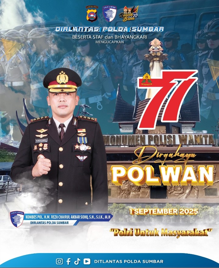 PADANG | Momentum Hari Ulang Tahun (HUT) ke-77 Polisi Wanita (Polwan) menjadi momen penuh makna bagi jajaran Kepolisian Republik Indonesia, termasuk di Sumatera Barat. Direktur Lalu Lintas (Dirlantas) Polda Sumbar, Kombes Pol H.M. Reza Chairul Akbar Sidiq, S.H., S.I.K., M.H., beserta staf dan Bhayangkari, menyampaikan ucapan selamat dan apresiasi yang tinggi atas dedikasi serta pengabdian Polwan yang telah menjadi garda terdepan dalam pelayanan, perlindungan, dan pengayoman kepada masyarakat, Padang Senin 01 September 2025.