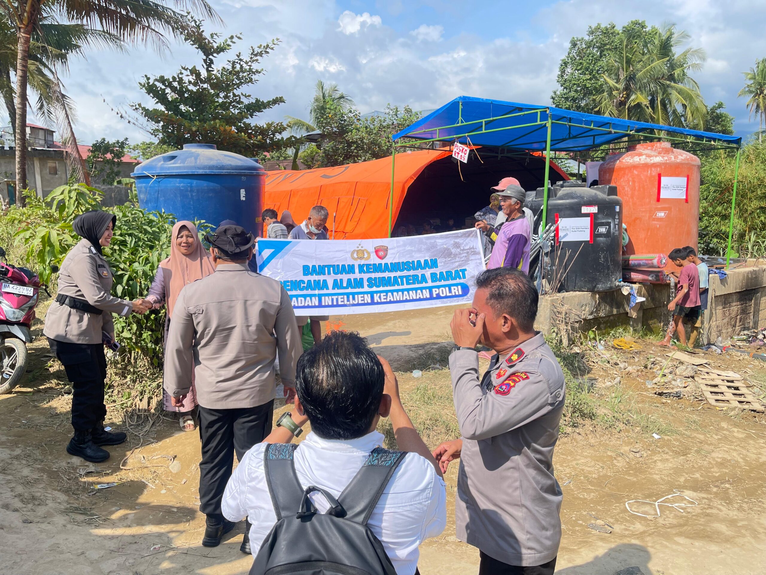 Di lokasi, warga terlihat antusias membantu membawa barang-barang bantuan ke tenda-tenda posko. Anak-anak, ibu-ibu, hingga para bapak bergotong royong bersama aparat polisi. Suasana menjadi hangat, meski kondisi pasca-banjir masih meninggalkan bekas lumpur di jalan dan rumah-rumah warga.