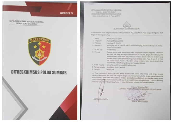 PADANG | Direktorat Reserse Kriminal Khusus (Ditreskrimsus) Polda Sumatera Barat resmi menerima laporan Andreanaldo Ademi terkait dugaan tindak pidana pencemaran nama baik melalui media sosial Facebook, Padang 19 Agustus 2025.