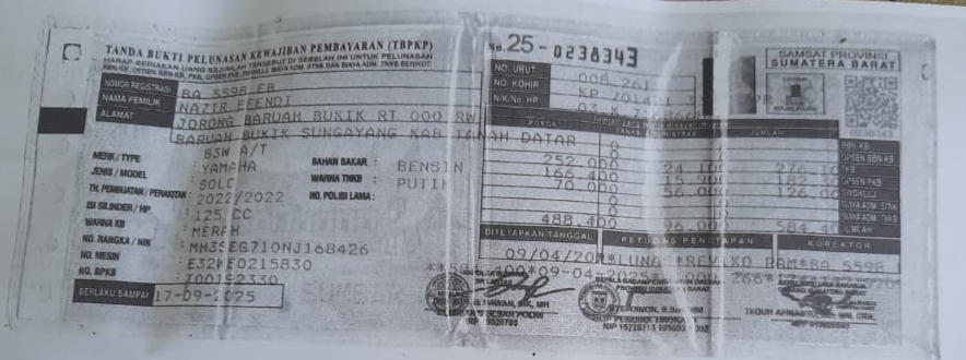 BPKB dan STNK motor yang terbakar pada Jum’at (14/11) pagi, atas Nama Nazir Efendi, dengan plat nomor kendaraan BA 5598 EB.