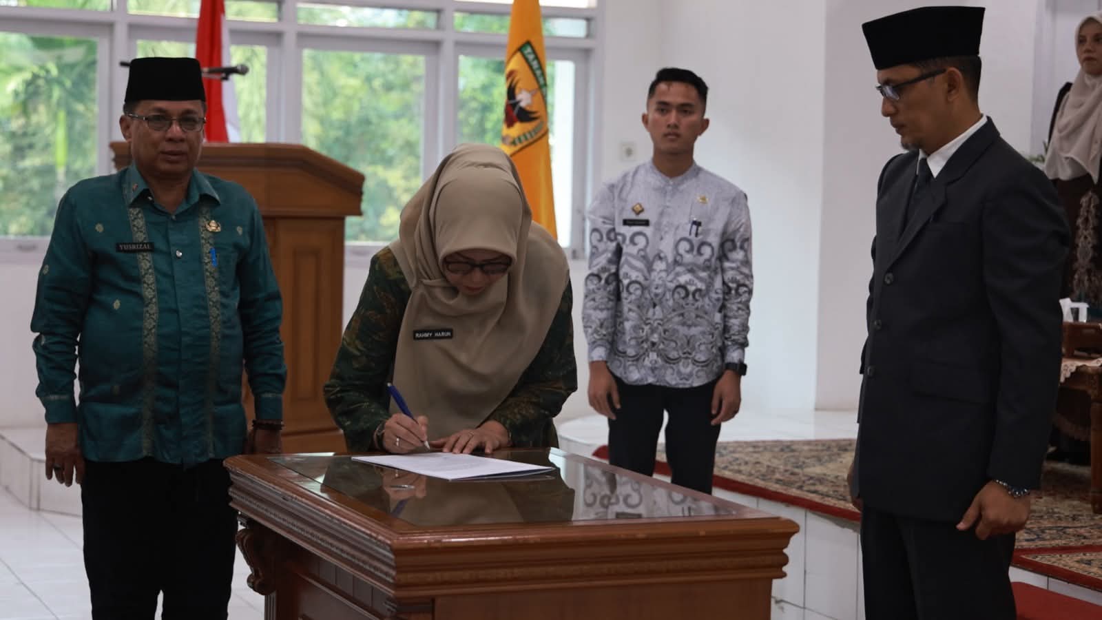 Turut hadir Asisten II Setda Tanah Datar Ten Ferry ST, M.Si, Asisten III Riswandi S.Pd, M.Pd, Staf Ahli Bupati Bidang Kemasyarakatan dan Sumber Daya Manusia (SDM) Drs. Suhermen, menjabat sebagai Staf Ahli Bupati Bidang Ekonomi, Pembangunan dan Keuangan Ir. Nofi Hendri, MT, Kepala BKPSDM Yusrizal MM, Inspektur Ir. Helfy Rahmi Harun, Kepala Dinas Pendidikan dan Kebudayaan Tanah Datar Dr. Alfi Hidayati, M.Pd, Kepala Badan Kesbangpol Drs. Mukhlis, Kepala OPD, Camat dan lainnya. (KT)